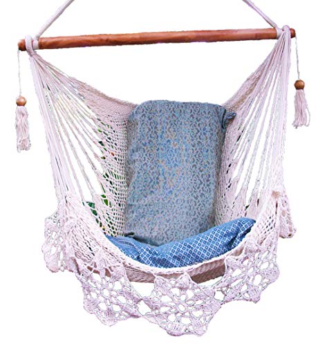 Wonderful hammock chair with flower crochet edge, handmade cotton with solid wood spreadbar Ideal for use indoor and outdoor, garden, bedroom, living, for birthday present, wedding, etc Measures Width 1.05 meters High 1.5 meters Total high: 2 meters Thanks for watching. Cushions not included. Color tone of cotton may vary.
