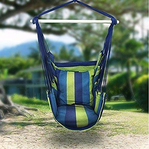 Introductions: Hanging chair, instead of its ultra comfort, also acts as a nice decoration for house fitment. Wanna buy one to adorn your house? Why don't you stop here and pay attention to our Distinctive Cotton Canvas Hanging Rope Chair with Pillows. It is in delicate design integrating top-grade cotton canvas and meticulous treatment. It brings great softness, durability and comfort. It has strong strength for supporting your weight. It comes with two soft pillow for daily convenience. You will never regret if you buy this offer! Features: 1. Wonderful fitment for home decoration 2. Crafted from premium cotton canvas, with good quality and softness 3. Durable long lasting wear-resistant construction 4. Stripe style adds special charm to the overall look 5. Come with 2 pillows for convenience 6. With excellent bearing force Specifications: 1. Material: Cotton Canvas 2. Color: Blue 3. Pillow Dimensions: (14.56 x 14.56)" / (37 x 37)cm (L x W) 4. Weight: 70.55oz / 2000g 5. Chair Width: 37.4" / 95cm 6. Weight Capacity: 519.99oz / 99790g Package includes: 1 x Hanging Rope Chair 2 x Pillows
