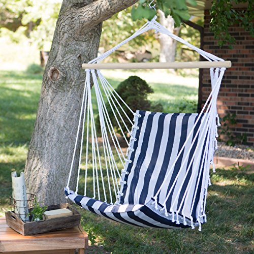 You'll enjoy your time at home even more when you sit in the The Ultimate Padded Mesh Hanging Chair - Navy Stripes. In addition to being suspended weightlessly in the air, you'll love the thick padded chair, made from layers of polyester. The navy and white-striped fabric complements most decor schemes. A durable wood spreader bar keeps the chair open so you can easily get in and out of it. Durable rope and a hanging ring is included so you can hang the chair immediately. Weight Capacity - 300 LBS.
