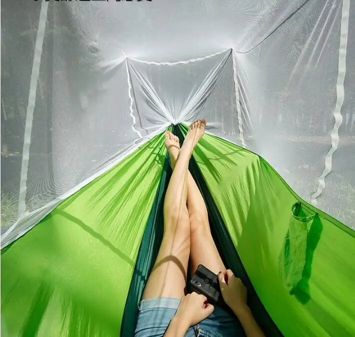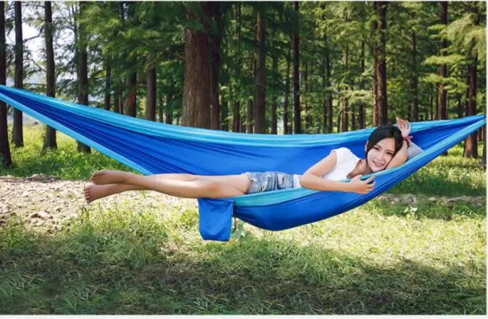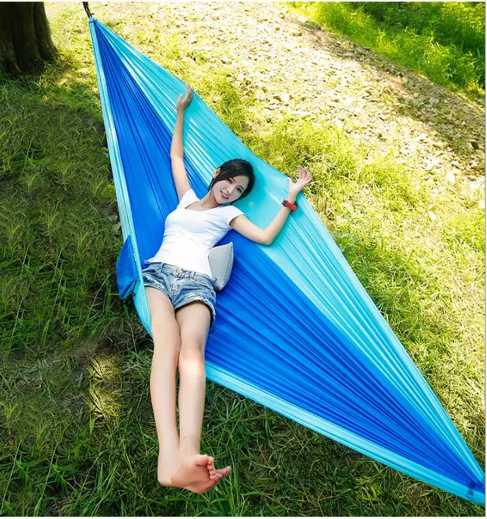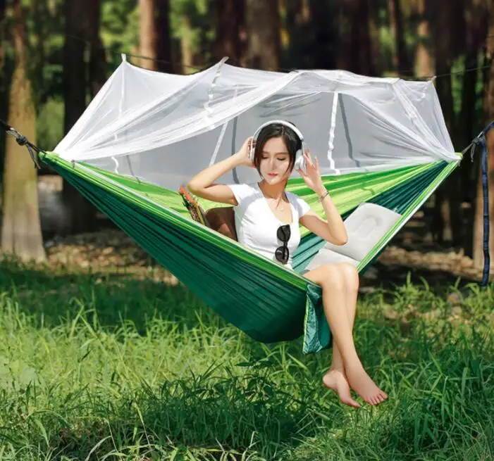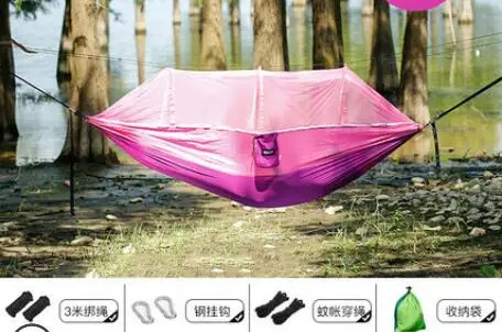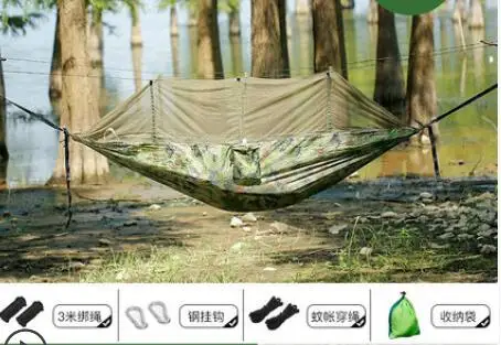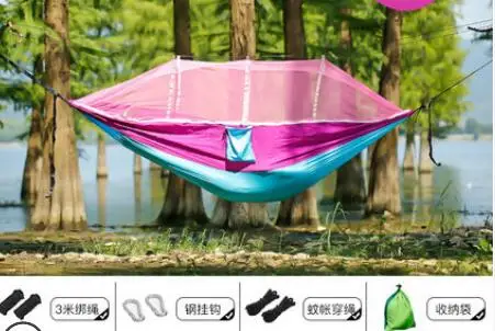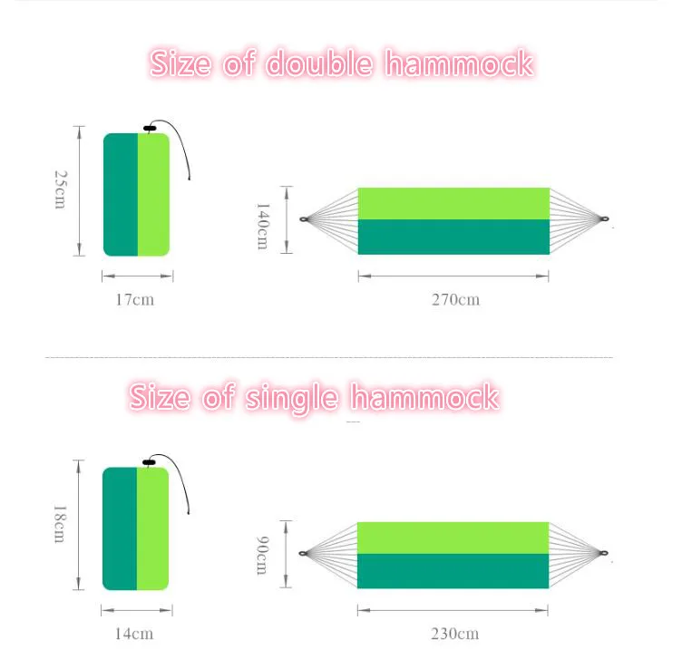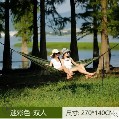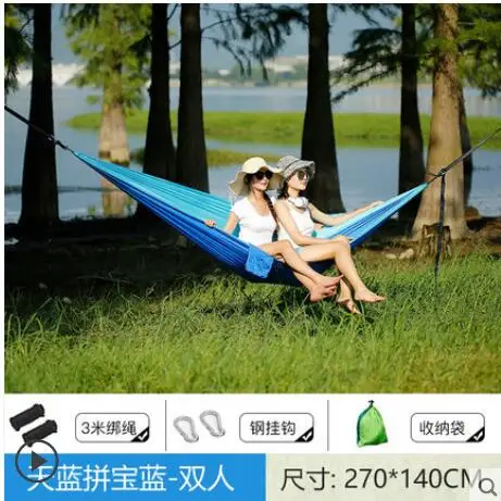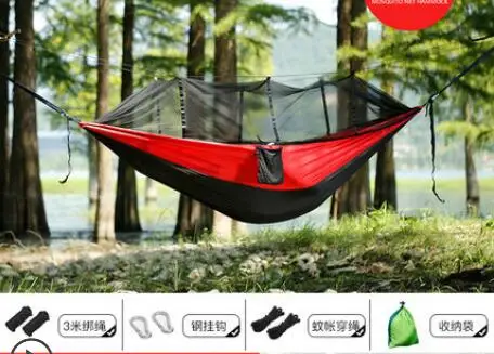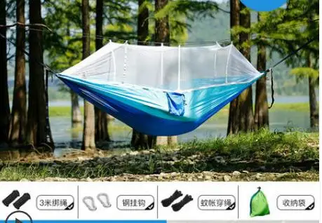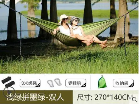 Outdoor Mosquito Net Parachute Hammock With Adjustable Straps And Carbines Large Stocking Camping Hanging Sleeping Bed Portable Swing bed Product Category: Hammock Material: 210T Nylon Cloth (the same material as parachute cloth) Mesh material: polyester mesh Size: 270x140cm/ Size of single hammock: 230x90cm Product bearing: About 300kg Feature: - Light weight, Breathable, Durable - Parachute cloth production, good storage. - Light and portable, soft and comfortable, clean and safe - Easy to hang and assembly - Suitable for outside and inside Packing list: 1 x Hammock Black gold steel buckle x 2, Double ring tree belt x 2(2 meters each),Convenient pocket Notice: Manual measurement, there may be 1-4 cm error. Due to different display and different product batch, the real picture and the colors may be a little different. Due to different product batch, the gift accessories, the rope may be look different.