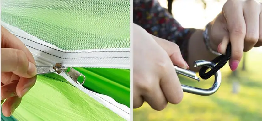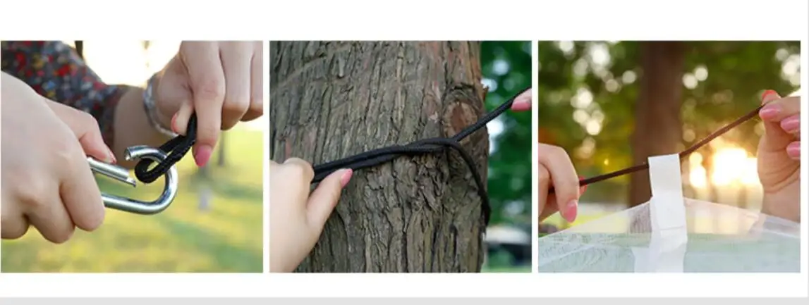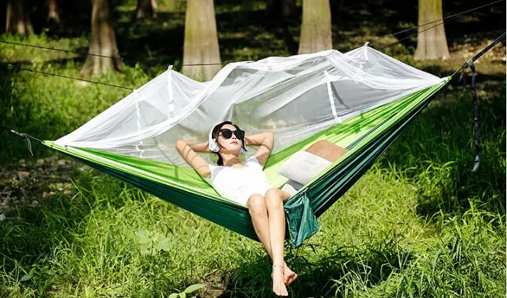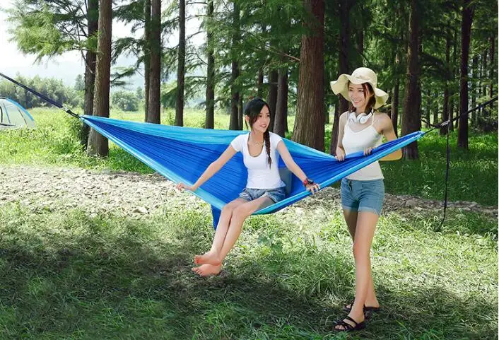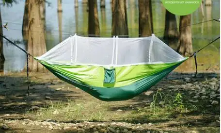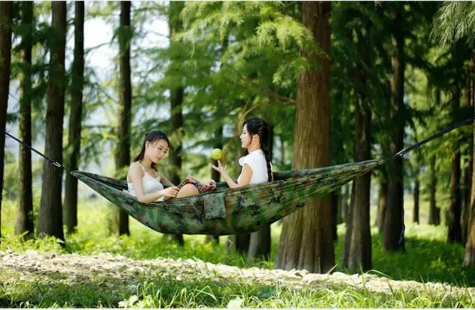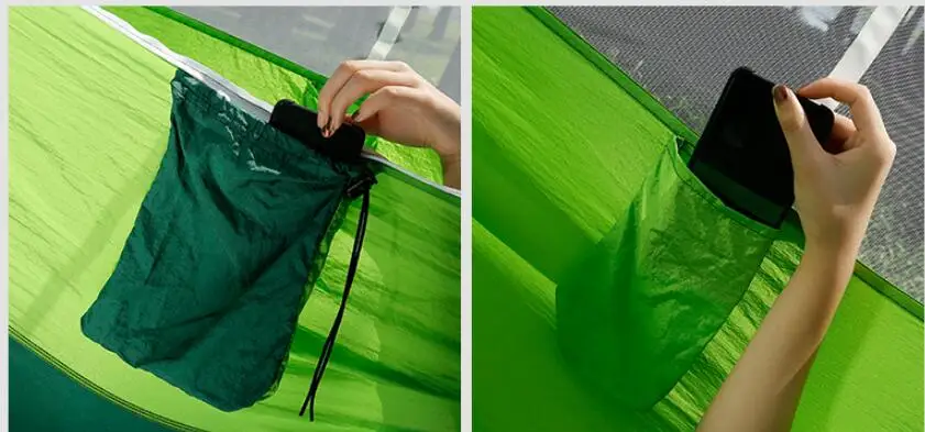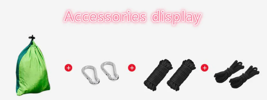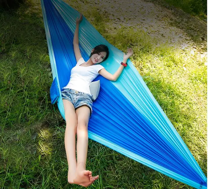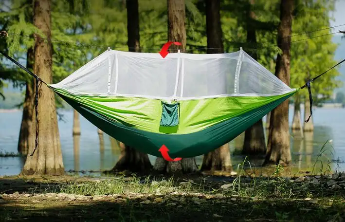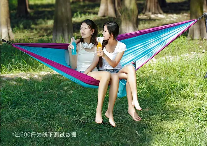 Outdoor Mosquito Net Parachute Hammock With Adjustable Straps And Carbines Large Stocking Camping Hanging Sleeping Bed Portable Swing bed Product Category: Hammock Material: 210T Nylon Cloth (the same material as parachute cloth) Mesh material: polyester mesh Size: 270x140cm/ Size of single hammock: 230x90cm Product bearing: About 300kg Feature: - Light weight, Breathable, Durable - Parachute cloth production, good storage. - Light and portable, soft and comfortable, clean and safe - Easy to hang and assembly - Suitable for outside and inside Packing list: 1 x Hammock Black gold steel buckle x 2, Double ring tree belt x 2(2 meters each),Convenient pocket Notice: Manual measurement, there may be 1-4 cm error. Due to different display and different product batch, the real picture and the colors may be a little different. Due to different product batch, the gift accessories, the rope may be look different.