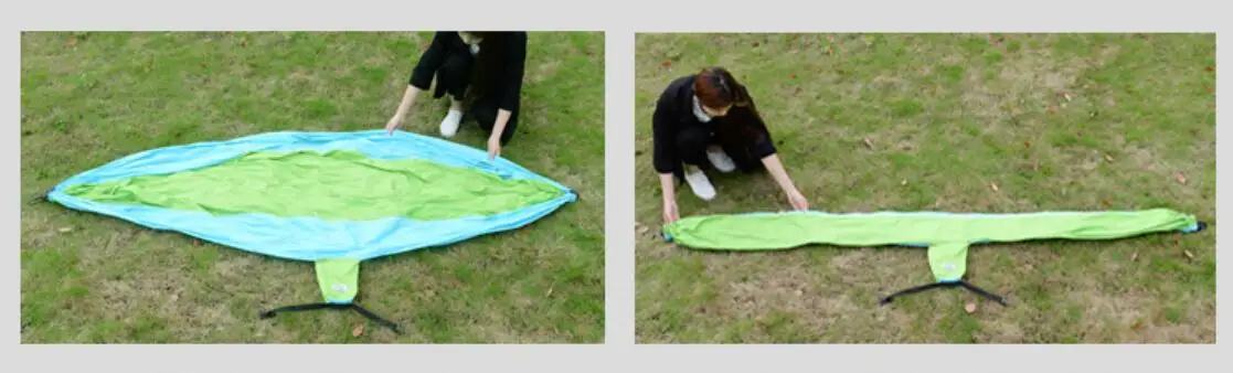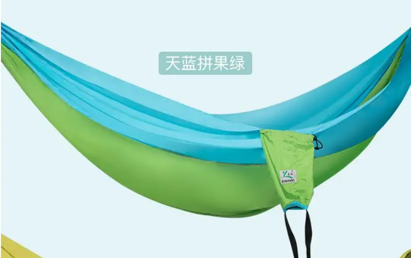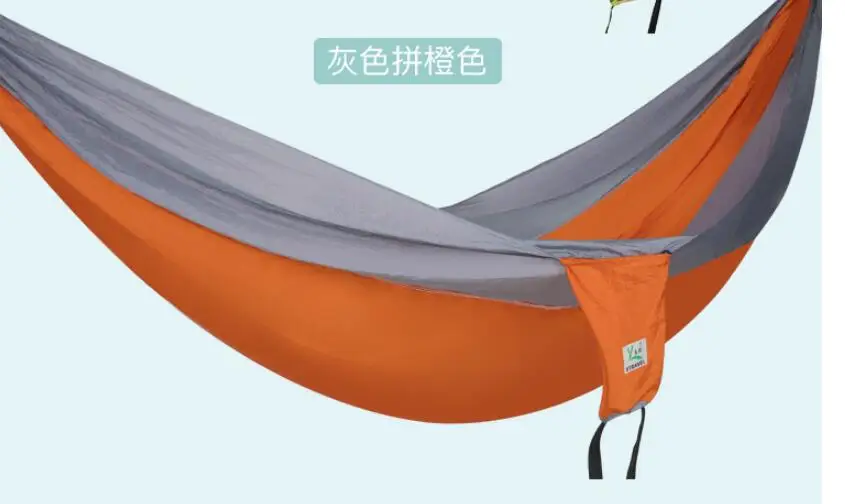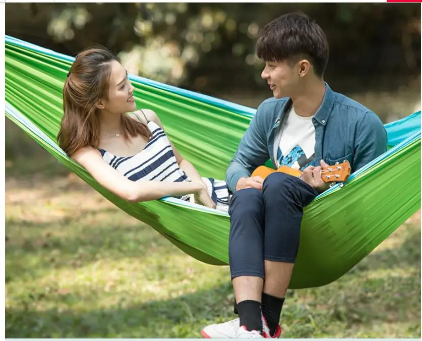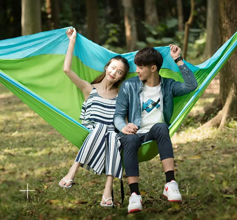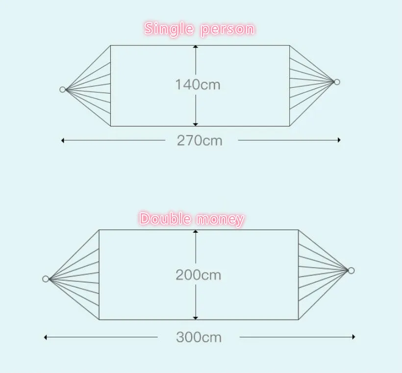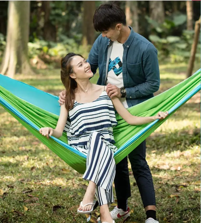 2 Person Outdoor Mosquito Net Parachute Hammock Camping Hanging Sleeping Bed Swing Portable Double Chair Hamac Army Green Name; parachute cloth hammock Product weight; Single person/0.92 kg, double person 1.07 kg 210T nylon shioze material; Specification; Approx 270cm*140cm The double hammock is about 300*200 cm Please allow 3-5cm error. thanks. Load: Max 200KG Recommend no more than 150KG for safety reasons. Packaging specifications; 20cm*24cm Package including: hammock*1 Mountaineering buckles, straps, pockets