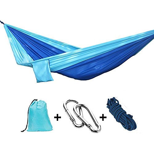 I am an avid camper, backpacker, and outdoor education instructor. I have been looking for a lightweight, easy-to-pack hammock for my spring and summer excursions, and believe I found the perfect one! When I purchased my hammock from OuTera, I was surprised how compact and lightweight the hammock was when bundled in its attached stuff sack - an ingenious multifunctional design! Once unpacked, I was relieved to find two very strong carabiners securely attached to each end.It was extremely easy to install between two sturdy trees by simply securing the ropes to either tree and effortlessly clipping the carabiners to each rope. Climbing inside, I could instantly feel the comfort of this hammock while being cradled by its smooth parachute material. Perfect for the occasional afternoon nap or even a multiple-night camping trip. This parachute hammock is very well built.The portable hammock seams are triple-stiched,my tests did not fully test this weight limit. The attached stuff sack doubles as a side pouch for things like a cell phone, cool beverage, flashlight, etc. The hammock fabric stretches just enough to cradle the forms of both of us without causing us to roll and bunch up in the middle. I plan on using this hammock for just myself, but I have no doubt that it would be just as comfortable with two adults. So if you are in the market for a lightweight hammock, this is the one to buy! The outdoor hammock versatile, lightweight design is perfect for backpacking, camping, or even just backyard lounging. I received this discounted hammock,I think the outdoor hammock is worthy price.recommend!