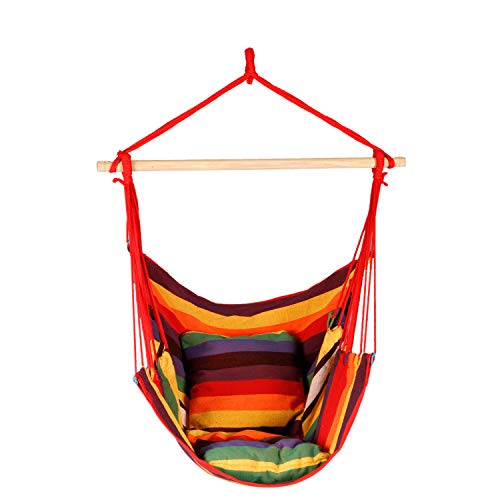 Description: There is nothing more relaxing for you than swinging in your Hammock Chair Porch Swing during the early morning hours, and late evenings. You will so happy with your purchase! Features: -The Hanging Rope Chair gives you the feeling of a childhood swing, no one hates it. - You can in it constantly...reading, listening to music, on your Kindle, or enjoying a quiet night of stargazing, etc. -This is a fantastic hanging chair hammock can be used as a light cradle and swing reading chair or relaxing meditation chair. - Makes a sweet snuggle swing to hang outside and enjoy nature, rest under the sunset, or relax poolside. It is indispensable in outdoor activities and gives you more enjoyment. - Sometimes, the hammock ropes would slide a bit off its groove. It's really not a problem to slide it back a bit occasionally. It's enough to support an adult. Specification: Product Dimensions: 35.5*17.7*43.3 inch Pillow Dimensions: 16*14*4 inch Item Weight: 4lb Wooden Bar Dimensions: (L)35.5 inch*(D)1 inch Weight Capacity: Max.265 Lb. Package Include: 1×Hanging Rope Chair 1×Wooden Bar 2×Pillow